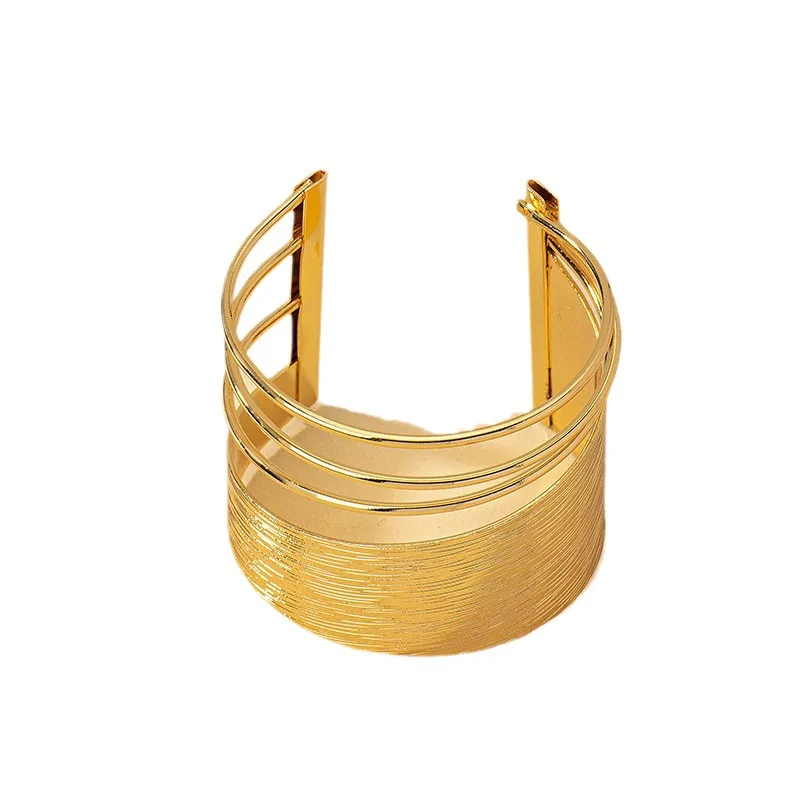Issu de la « Collection Princesse du Désert », cet ensemble audacieux marie une manchette large texturée à un trio de joncs fins et lisses. Sublimé par un placage Or 18K véritable (Electroplating), il offre une brillance solaire et une résistance durable. Un set modulable pour une allure royale, de jour comme de nuit.